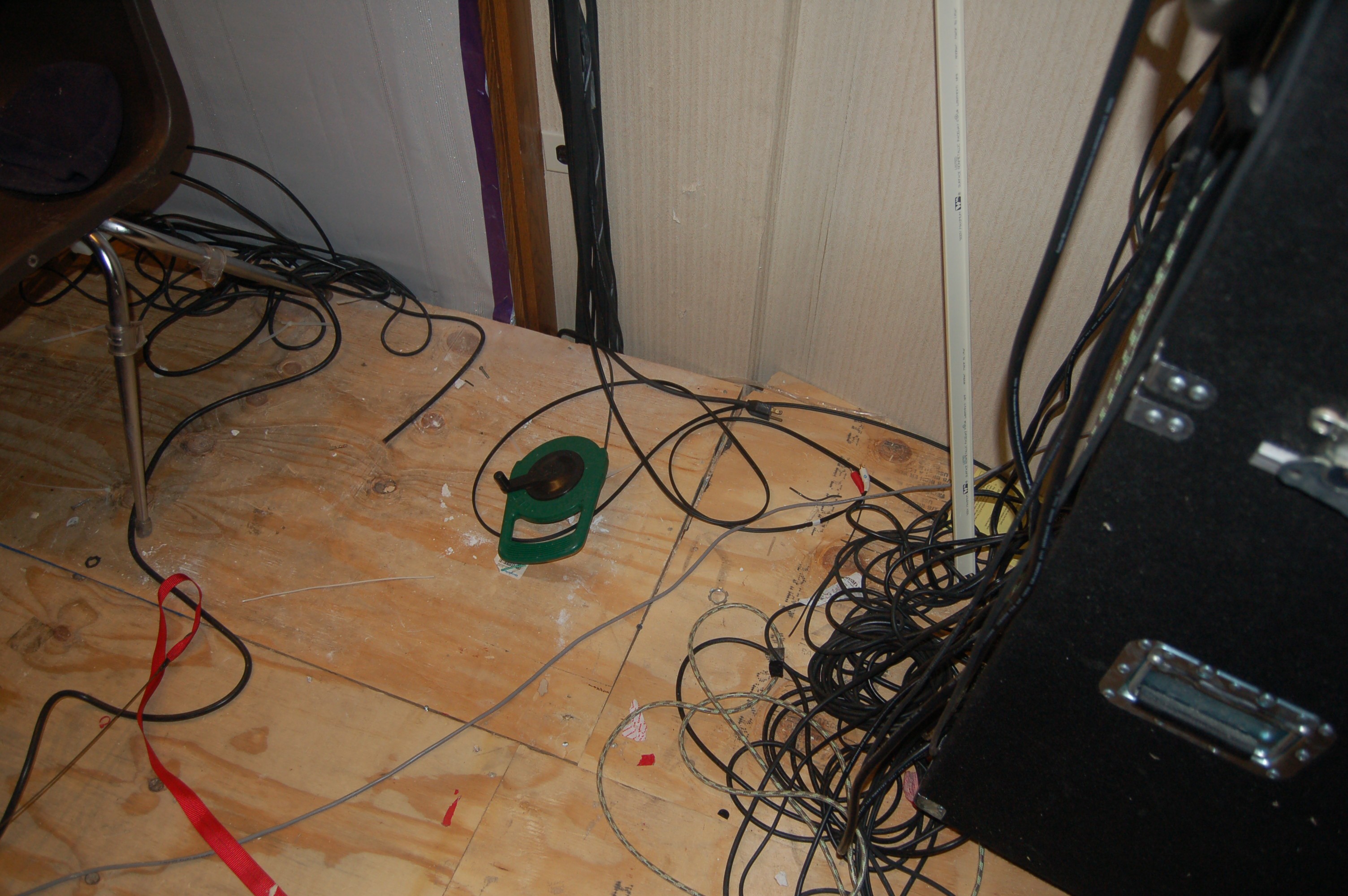 This progress photo shows wiring along the back wall  of the sound booth as we pulled it beneath the existing floor. As we completed pulling a wire through, we secured the wire by cable  wrap to keep the wires from straying or pulling. You can also see the abundance of wiring that connected pieces of equipment lying on the floor.