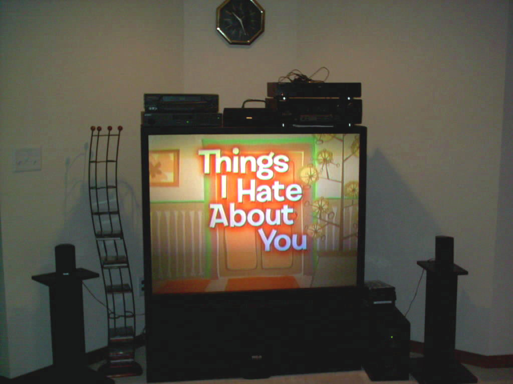 The Bowland family basement project presented a completely different set of challenges for HDT Sound. The Bowlands had recently moved into their new home and they had all of their equipment stacked on their big screen. Our objective was to relocate all of the equipment into a nearby closet, out of sight and give them the ability to change channels, or sources without having to get up and go to the closet. We also needed to hide or minimize all wiring from the speakers and video devices once the equipment was relocated. This photo shows all of the equipment they had and how it was arranged prior to our work.