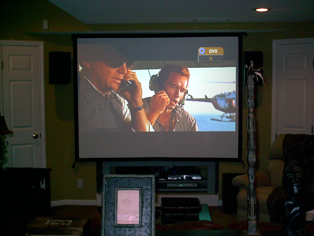 Here is a completed  photo of the theater. The same cutout that was shown in a previous photo has been utilized by placing a component table inside it which maximized the seating area. We selected a component table that would fit perfectly in the space. The center channel is behind the screen creating a true theater experience. As you can see, the theater blends with the surrounding environment to create a wonderful space that the family enjoyed greatly.