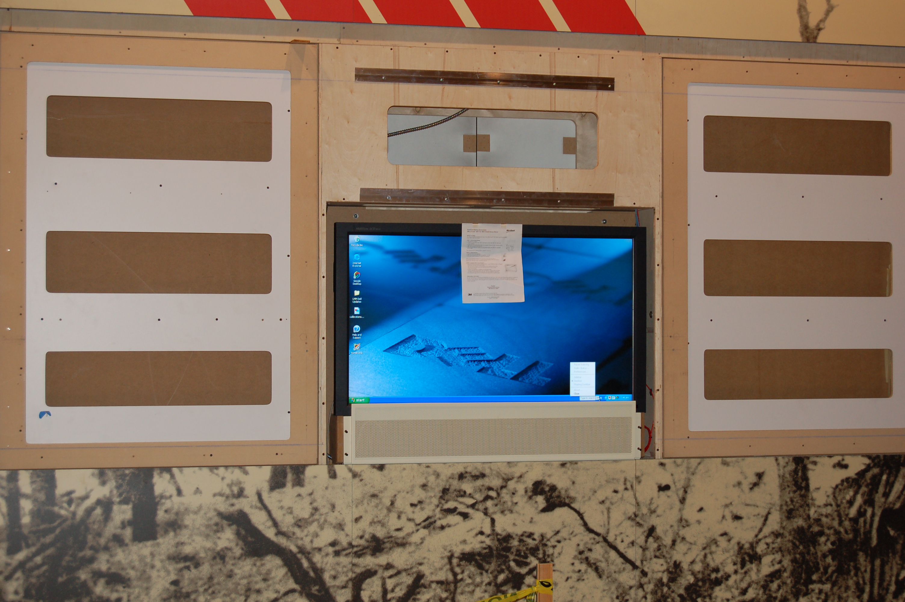 | This photo shows the second 46" LCD flat panel that is to be used as a battlescape map. As you can see from this photo, not all of the finish panels for this wall had been installed. You can see the desktop for the computer that controls the content for this touchscreen displayed on the monitor. As was the case with the other touchscreen battlescape map, the audio speaker is located below the monitor located behind the perforated grate panel. |