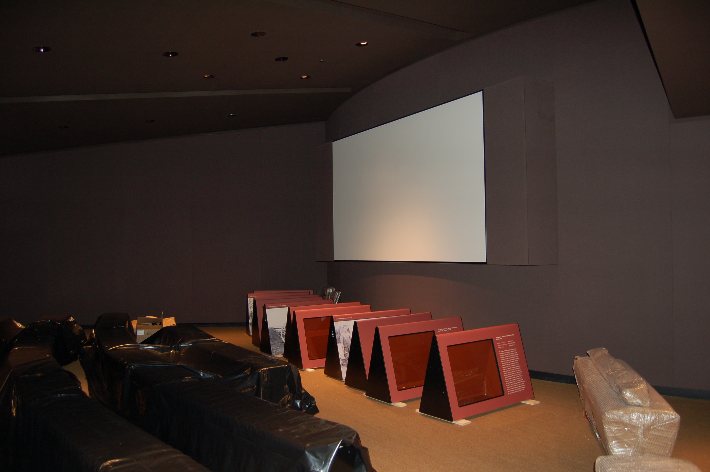 | This is a photo of the Orientation Theater, located within the Liberty Memorial Museum, during construction. In this photo, the screen has been hung and the seating benches have been installed and covered in black plastic. The miscellaneous items on the floor are display cases that were to be placed throughout the museum. The main speakers, and subwoofers for this theater are located in the two grey mounts on either side of the screen. We also have mounted speakers along the side walls behind the finished material to provide the full theater effect, while creating a beautiful environment. |