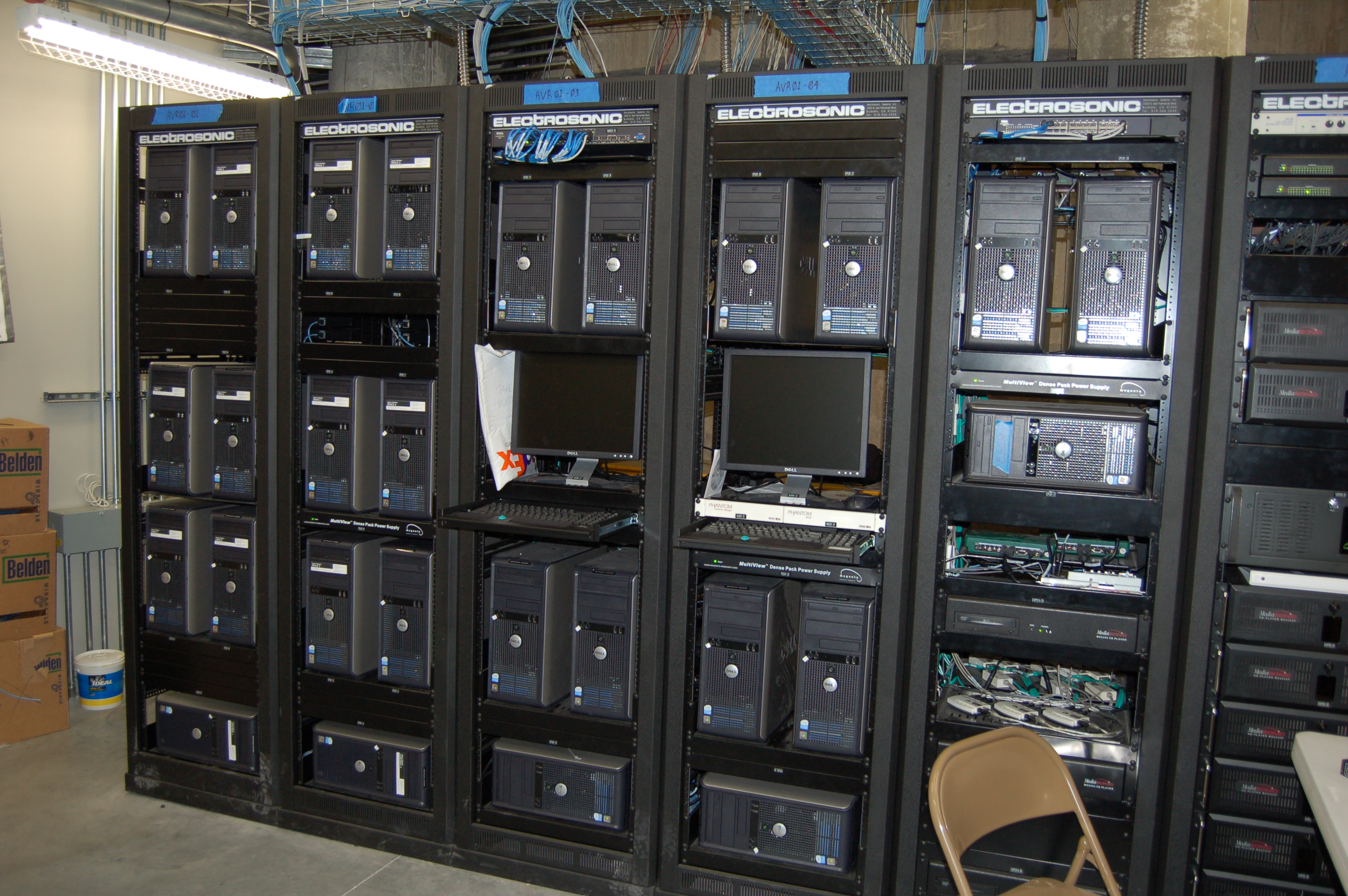 |        This photo shows five of the ten control racks located in the control room. These five racks in particular house all of the computers that control the two issues tables, the two battlescape maps, and the ten portrait wall monitors located in the main hallway. All video is routed via the wiring that rises above the rack and along cable trays to their designated location. You can see a portion of this wiring housed in the cable tray above the equipment racks.   |
