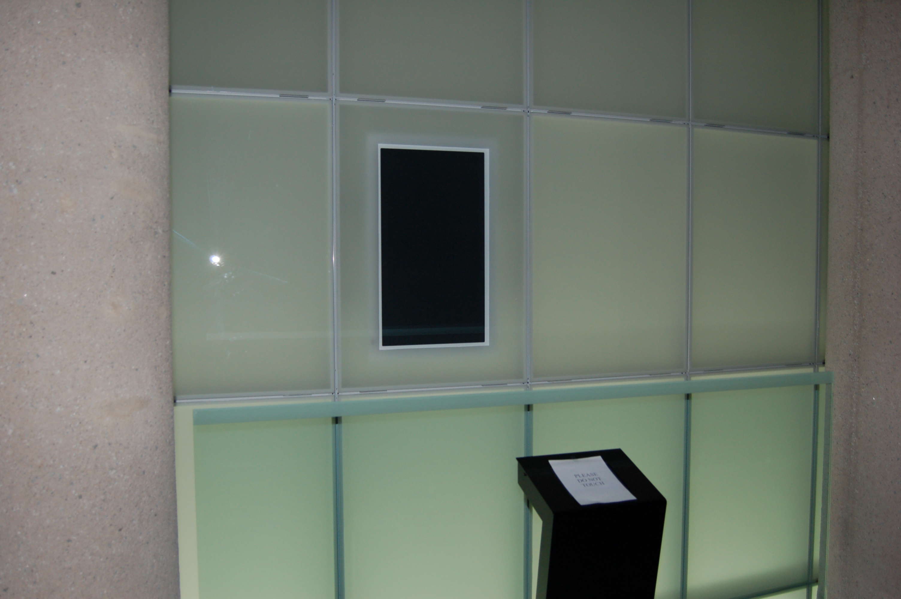 |        In this photo you see  one of the ten portait wall monitors located in the outer main hallway of the museum. These 50" plasma televisions are controlled by  a touchscreen monitor which is located in the black pedestal at the bottom of the photo. The user is able to scoll through and select a photo on the touchscreen, and an enlarged image of the photo selected is displayed on the plasma screen in front of them.  |