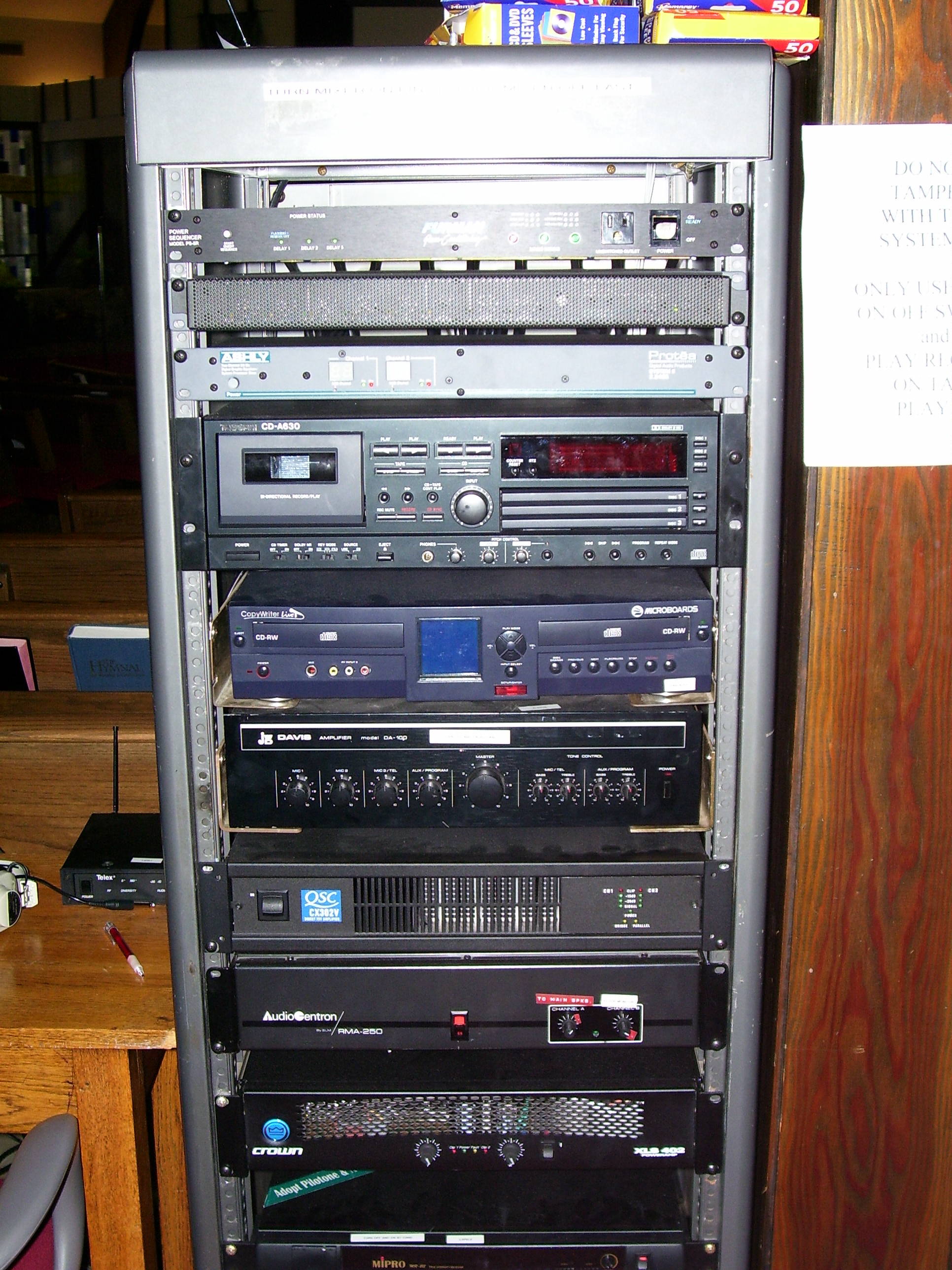 Here is a photo of the  audio rack after it had been relocated to the rear of the sanctuary. In this photo, we have reassembled all of the existing items of equpiment and placed them in their proper position in the rack. From this location, we installed a new 16 channel audio snake and patched or replaced all existing wiring to complete the system.   |