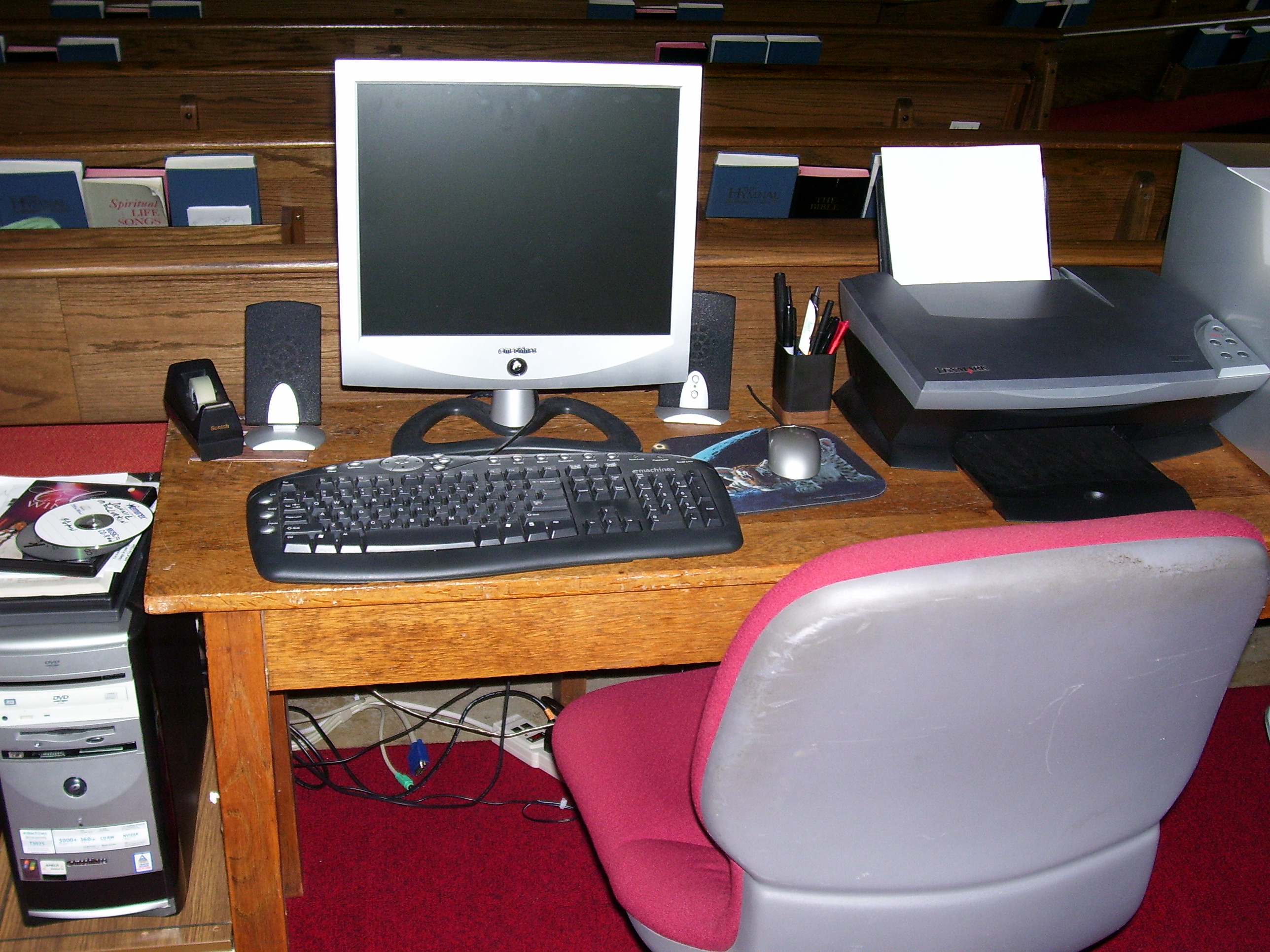 Here is a photo of the computer workstation that controls the video projector. From here, the church can run  presentations,  video and scripture on the screen as needed. They also use the DVD player on the computer to play movies on movie nights. This gave the church maximum flexibility and usage for their video system. All of the audio from the computer is routed to the mixer so that the main system is used for the audio.