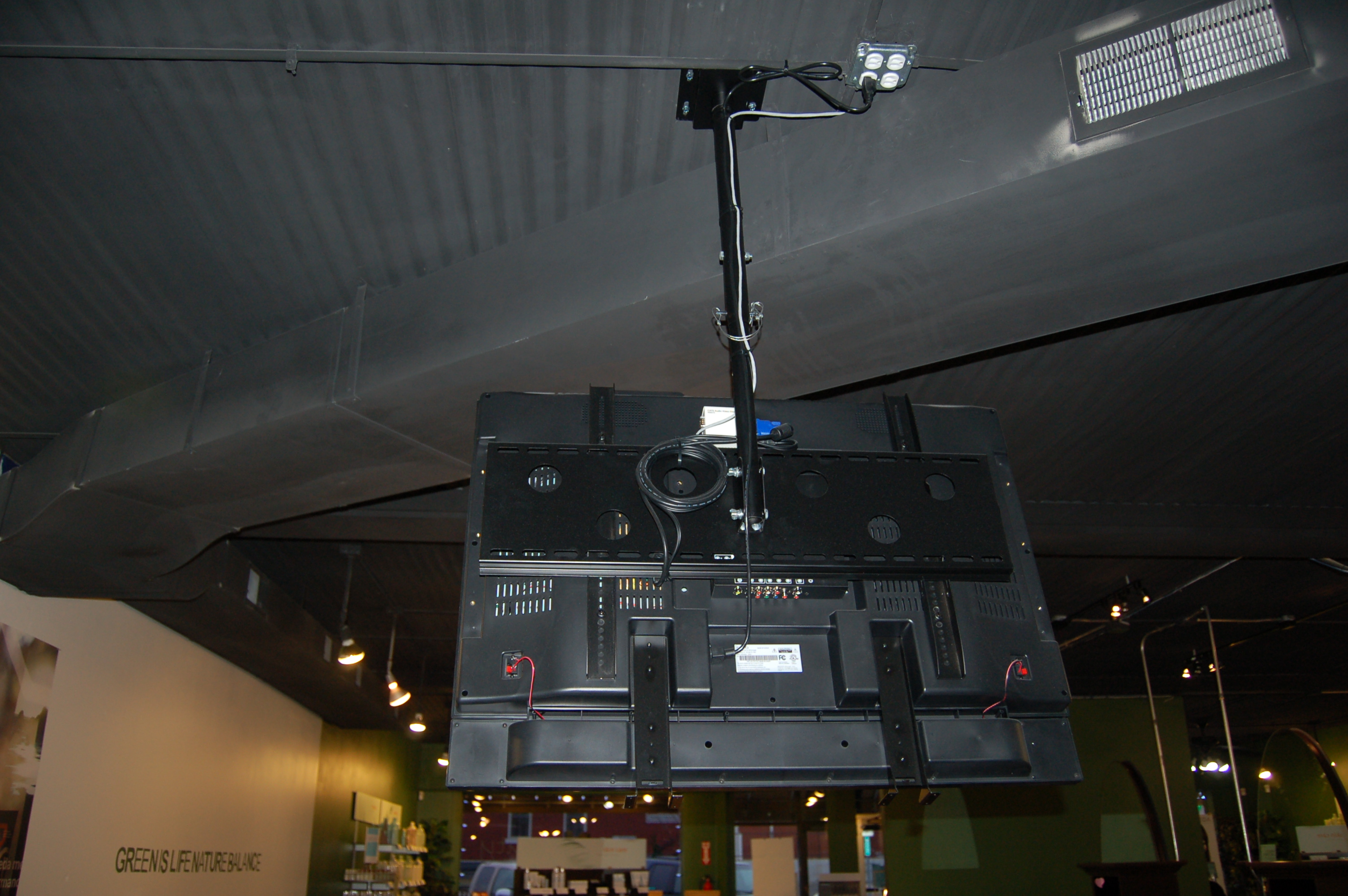 In this photo you see the rear of the flat panel unit with the ceiling attached flat panel mount. We had an electrical outlet run to the location in which we were to install the unit making for a clean installation. All connections were made with Cat5E cable that ran from the unit to a computer that was located in the rear of the facility. As with the Avalon Day Spa installation, all media could be uploaded by our client via internet connection making interruptions unnecessary once installation was completed. All cables were tidied up to make an attractive presentation since the rear of the unit could be seen from within the salon.